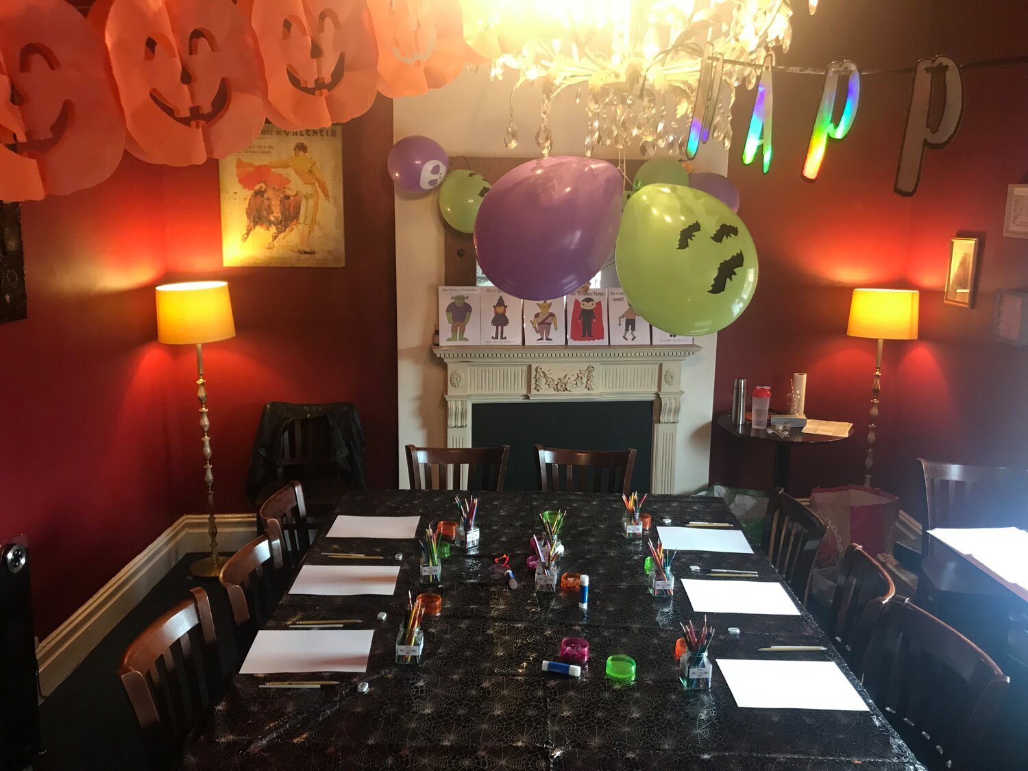 We had a super spooky time at The Teacup Doodles Halloween workshop this month. I’m a bit of a fan of Halloween because I love the excuse to get dressed up. I wanted to create a fun, party atmosphere for the children so I decorated the room in advance with Halloween themed decorations and balloons.